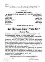 Anlässlich der Tage der jüdischen Kultur und Geschichte verlieh der Förderverein „Neue Synagoge Magdeburg“ e. V. am 6. November zum dritten Male den Hermann-Spier-Preis. Ausgezeichnet wurden durch den Vorstand des Vereins eine Schülerin der Schule des Zweiten Bildungsweges mit dem 1. und die Auszubilden der Klassen IT15 und KBM14 d der BbS „Eike von Repgow“ mit je einem 2. Preis.